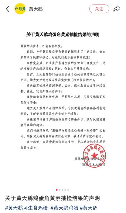 3月25日,黄天鹅发布角黄素抽检成果声明并附检测演讲。声明称,事务发生后,企业出产所正在的监管部分高度关心,企业同步开展自检。目前,三地监管部分抽检及企业自检的检测成果已反馈至企业,均为黄天鹅鸡蛋未检出角黄素。另据报道,为打假团队出具演讲的检测机构合规性遭到质疑:青岛市市场监管局公示消息显示,青岛元信检测手艺无限公司因“出具不实查验检测演讲”“数据无法复核”等问题,已于2026年1月12日被行政惩罚。食物平安关乎亲身好处,消费者等候的并非反转取拉锯辩论。跟着更多消息公开,事务脉络和终将清晰。