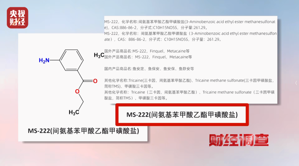 商户向记者展现的MS-222,俗称甲盐,化学名间氨基苯甲酸乙酯甲磺酸盐,为白色结晶粉末,对鱼类有麻醉感化。